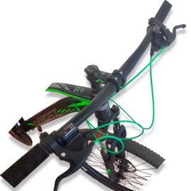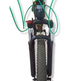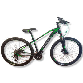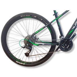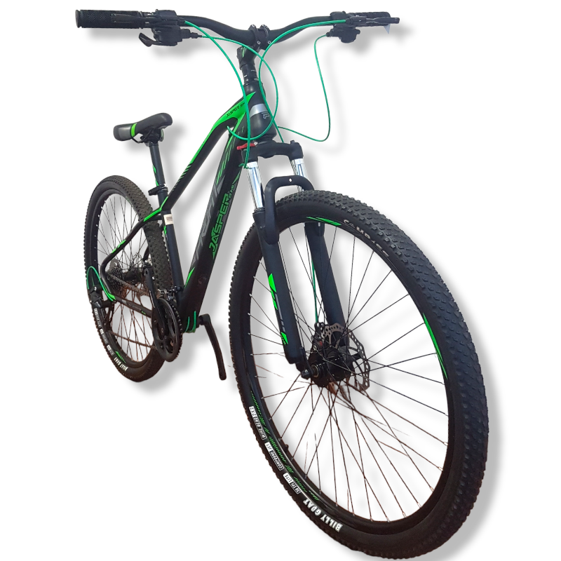 Viene en color negro con funda verde y está equipada con una transmisión de 3x9 velocidades de la marca Profit. Sus componentes incluyen manubrio y potencia de aluminio, así como un poste de sillín de aluminio. La suspensión cuenta con bloqueo, lo que permite ajustarla según las necesidades del terreno. Además, tiene shifter Profit, frenos de disco mecánicos y cableado interno para un aspecto limpio y ordenado. Las llantas son de doble pared.